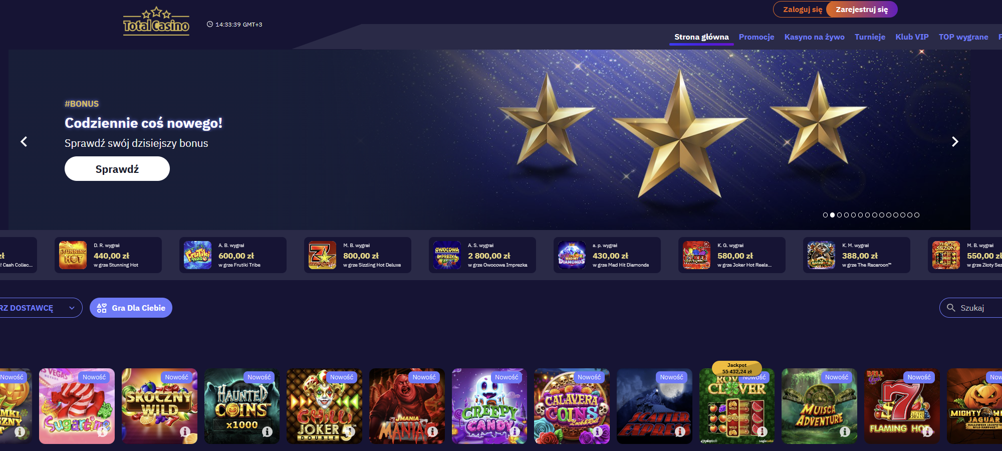 Total Casino wyróżnia się jako najlepszy wybór wśród kasyn BLIK w 2025 roku z kilku powodów. Po pierwsze, oferuje solidny pakiet powitalny, który obejmuje bonus 120% do 5 950 PLN oraz 225 darmowych spinów. Ta kusząca oferta zapewnia nowym graczom dodatkowe możliwości odkrywania i cieszenia się szeroką gamą gier. Kasyno posiada ogromną bibliotekę, obejmującą ponad 10 000 gier od licznych dostawców, dzięki czemu gracze mają dostęp do zróżnicowanych opcji rozgrywki dopasowanych do ich preferencji.